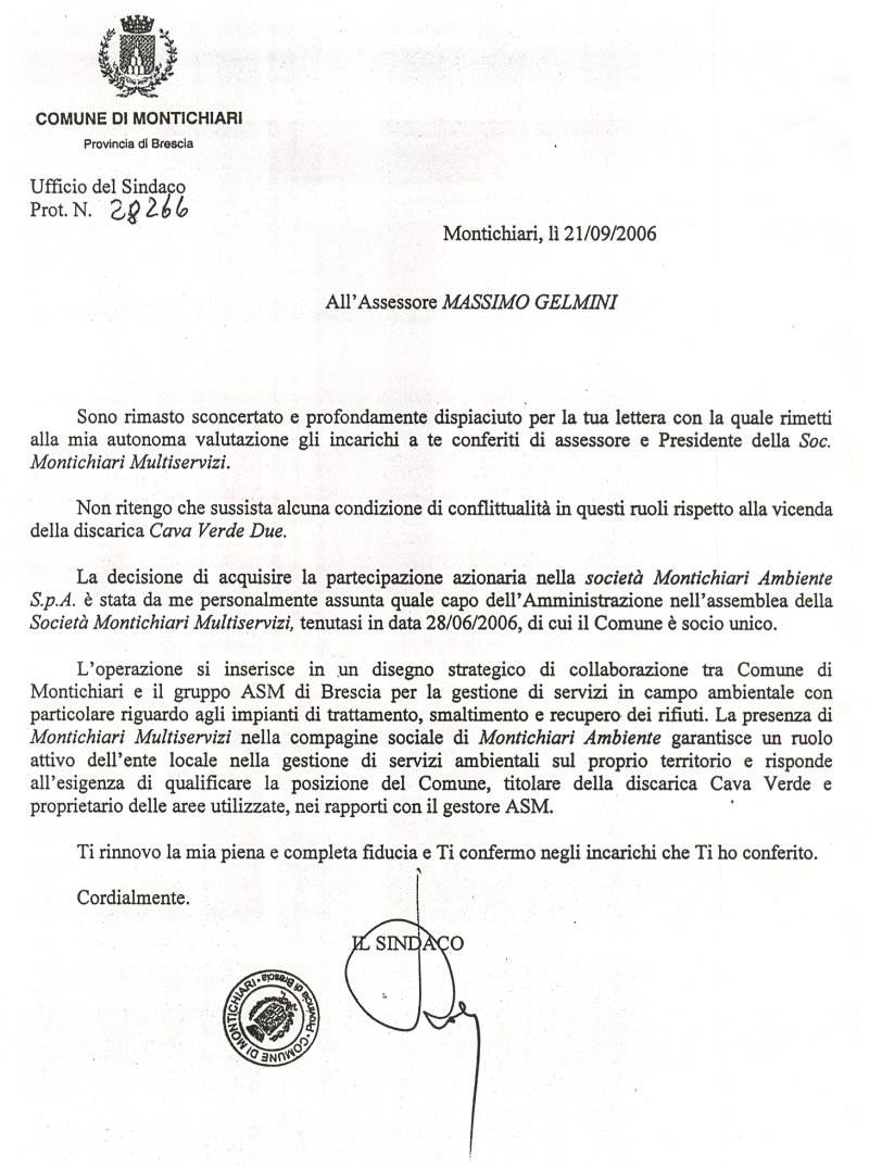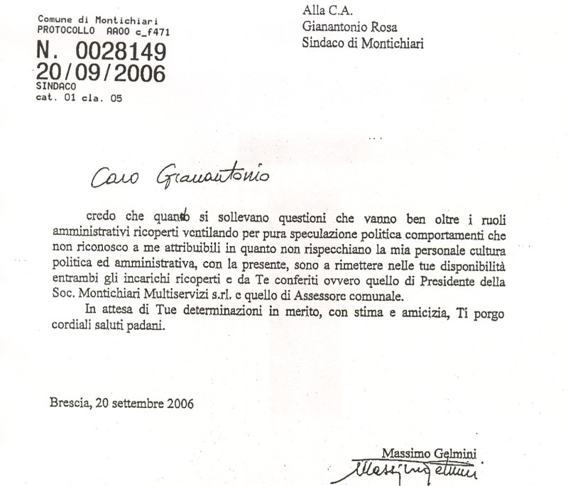 Abbiamo per ora conclusa la storia, questo Dossier speciale a futura memoria. Nel pieno rispetto dello scopo di questa Associazione (informare, far partecipare e far confrontare i Cittadini, democrazia e trasparenza) crediamo di avere ancora una volta assolto il nostro compito. Materiale ve n'è in abbondanza affinché ognuno si possa fare la propria liberissima opinione. Se abbiamo commesso qualche sbaglio siamo pronti a correggere. I pareri potranno essere opinabili ma sono chiaramente espressi e presentati in assoluta onestà intellettuale. Ci aspettiamo che si smetta di credere che i Cittadini siano solo dei menefreghisti da coinvolgere solo in fase elettorale, senza mai fare chiarezza, senza porsi davvero in discussione. Il signor Massimo Gelmini ha la nostra stima per le sue doti e le sue capacità ma non possiamo dimenticare che ha occupato i posti di potere (tanto) ovvero le cosiddette "sedie" senza passare mai dalla fase elettorale; non si è fatto cioè giudicare e quindi votare, ma è sempre stato nominato dai Sindaci leghisti, sostanzialmente per assecondare la volontà di controllo di un Partito, per giunta minoritario. Voler far credere oggi che si possa sostituire a metà mandato il proprio rappresentante politico di maggiore grado amministrativo locale (Vicepresidente provinciale del bresciano) per soli scopi di rotazione d'incarichi è veramente voler prendere in giro i Cittadini, farsi beffe di loro, della loro intelligenza, e del rapporto di fiducia che deve sempre essere mantenuto tra eletti ed elettori. Ed infine: siamo pronti a scommettere che il signor Gelmini, come altri di altri Partiti prima e dopo di lui, assumerà incarichi superiori a livello regionale o provinciale ... ma questo non farebbe che confermare lo strapotere della politica della partitocrazia rispetto alla politica della trasparenza. CHIEDIAMO SCUSA A CHIUNQUE POSSA SENTIRSI OFFESO PER QUESTO DOSSIER E AFFERMIAMO CHE NON SI E' QUI ASSOLUTAMENTE INTESO ACCUSARE NESSUNO DI ALCUNA MALEFATTA, PER CUI OGNI DIVERSO PARERE, SERIO, DOCUMENTATO E MOTIVATO POTRA' ESSERE VALUTATO E, SE DI INTERESSE GENERALE, PUBBLICATO. FINE Grazie dell'attenzione, con un ringraziamento ai quotidiani per avere potuto usufruire del loro materiale