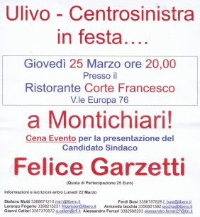 7 Giugno Il nostro territorio Ristorante Boschetti da Nicoli a Montichiari ore 20.30 On Francesco Ferrari candidato alle elezioni Europee Gian Antonio Girelli coordinatore provinciale della Margherita Felice Garzetti candidato sindaco dell'Ulivo Centrosinistra La difesa del territorio Riflessioni sul Piano Regolatore Generale di Montichiari. |