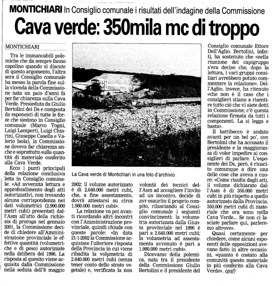 della Cava Verde In consiglio comunale a Montichiari è tornata la Cava verde. Una questione, quella del grande impianto di smaltimento, per cui si è resa addirittura necessaria la costituzione di una commissione dindagine. . (omissis) Si è inserita l'altra sera anche la costituzione, voluta dal sindaco ed approvata in