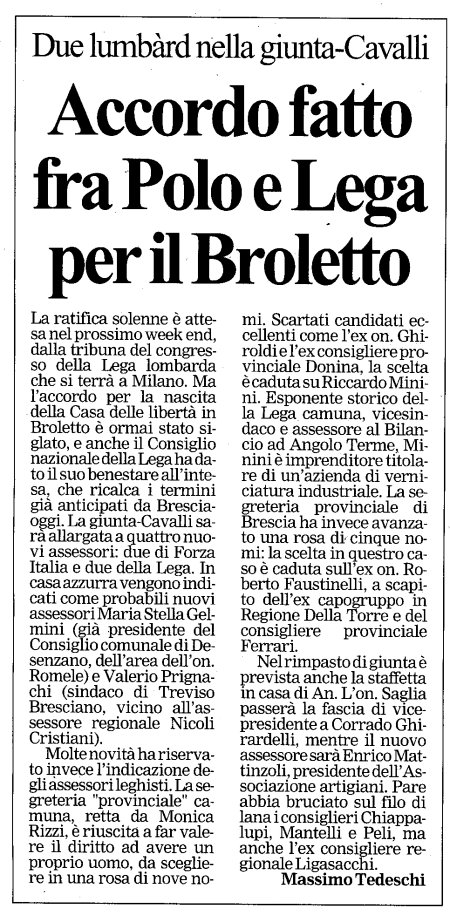 | Da Bresciaoggi del 15 ottobre 2001 : LEGA,