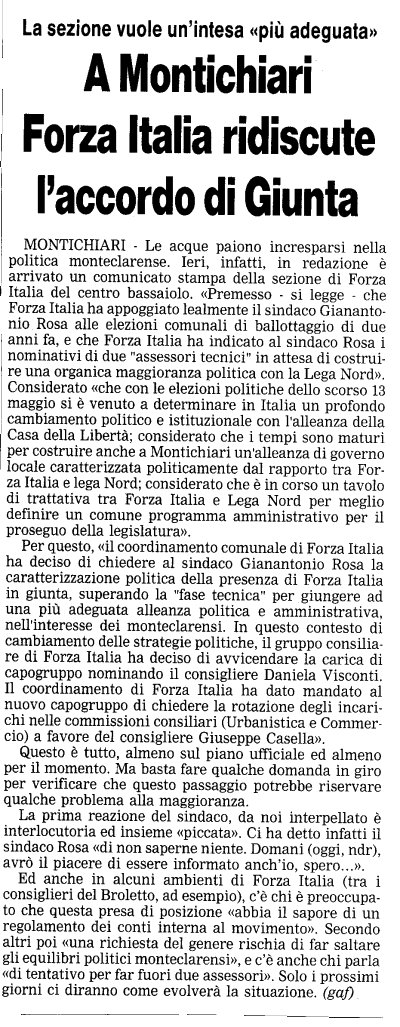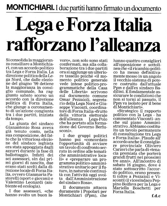 In Consiglio comunale a Montichiari, il 20 dicembre 2001, ... ...Forza Italia passa alla opposizione: votando contro il bilancio comunale del 2000 e triennale 2002-2004, il gruppo consiliare denuncia la "frattura intervenuta tra i partiti del Polo delle Libertà e la Lega Nord", gravida di conseguenze politiche che rendono inevitabile il passaggio del Polo ad una fase di "opposizione responsabile". La Lega (circa 28% alle comunali del 1999 e 19% alle politiche del 2001) approva da sola un bilancio da 25 milioni di euro, raccogliendo l'astensione del Presidente del Consiglio Dell'Aglio (FI). |