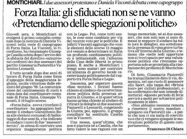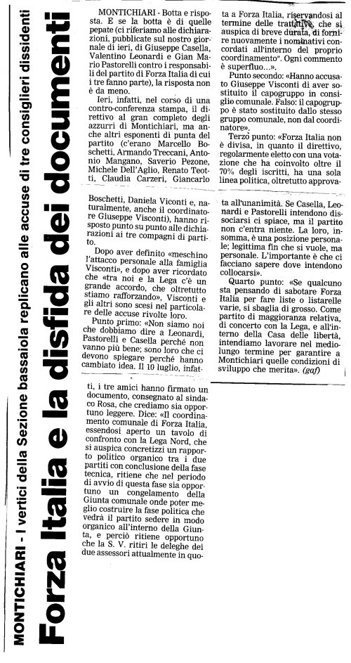 "Boccia" il Capogruppo Casella, "dimissiona" il vicecoordinatore Ferrari e chiede al Sindaco di sostituire i "suoi" Assessori Pastorelli e Leonardi per far largo a coloro che dovrebbero sostenere una nuova fase della auspicata alleanza con la Lega. leggi articoli : G.di Brescia (1) e (2) e (3) del 25,26 e 27 luglio e l'articolo del 27 e 31 luglio su Bresciaoggi (4) e (6) Tutto è partito con l'annunciata intenzione di trovare un accordo politico tra LN e FI, illustrato nell'art. di Bresciaoggi del 20 giugno (5). |