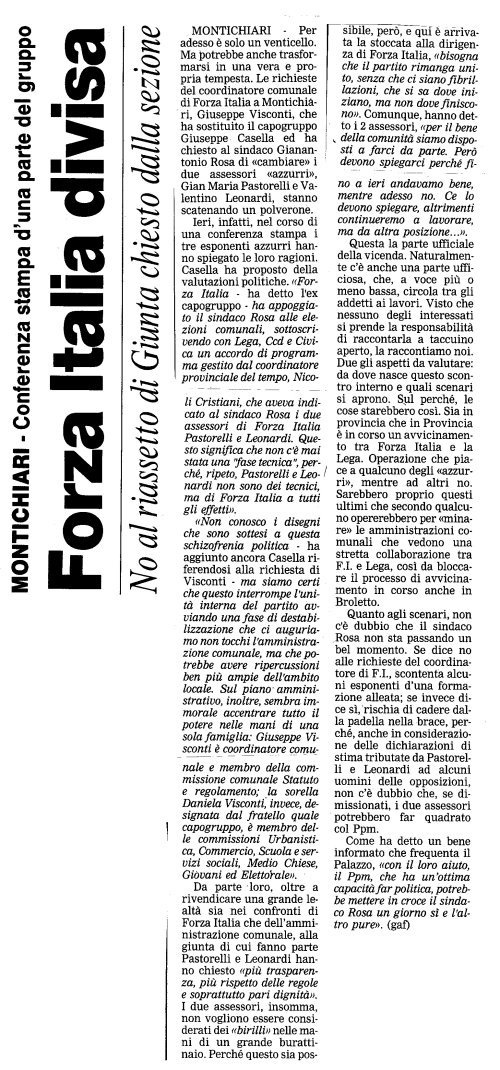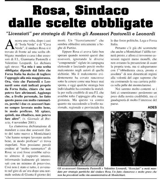 BresciaOggi del 5 Novembre 2001 MONTICHIARI. Inizia il rimpasto in Giunta Rosa cede a Forza Italia e Pastorelli e Leonardi non sono più assessori Il sindaco di Montichiari, Gianantonio Rosa, ha iniziato a rendere concreto il rimpasto