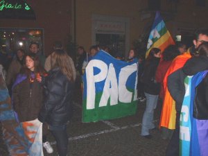 IL 26 MARZO, COLORO CHE PROPOSERO LA MARCIA DELLA PACE, HANNO ORGANIZZATO UN "PRESIDIO PER LA PACE" : ECCO IL TESTO DEL VOLANTINO FERMIAMO LA GUERRA Mentre arrivano nelle nostre case le immagini della dura realtà di una guerra che non è spettacolo mediatico, ne un videogioco, ma azione di distruzione e morte; non possiamo dimenticare che la guerra in corso è fuori dalle regole del diritto internazionale ed è illegittima. Essa, infatti, è stata decisa senza dare tempo al lavoro iniziato dagli Ispettori ONU e che avrebbe portato ad un disarmo certo, graduale e pacifico; senza tenero conto dellopinione di tanti Governi, dellalto richiamo del Santo Padre e dellopinione pubblica mondiale che è schierata contro la guerra. Unilateralmente le amministrazioni Bush e Blair hanno avviato un conflitto che aggraverà la situazione nei rapporti con tutti i paesi Arabi , porterà a incontrollabili tensioni in tutto il mondo e prima di tutto ucciderà tanti civili innocenti e indifesi. Noi condanniamo la dittatura di Saddam Hussein, al pari di tante altre