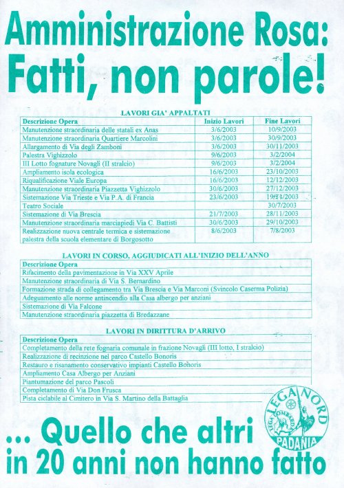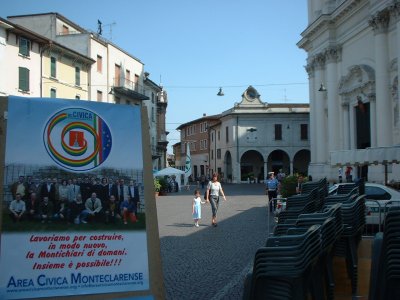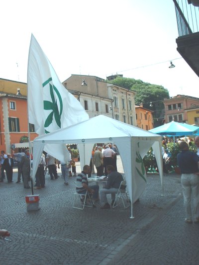 IN PIAZZA GARIBALDI IL 1° GIUGNO 2003 A Nord il gazebo della Lega, a Sud l'ombrellone dell'Area Civica Monteclarense. L'ACM distribuisce materiale informativo sulla neo formazione, la Lega, tra cui alcuni Consiglieri comunali, un volantino fronte retro stampato in verde : da un lato l'elencazione dei meriti della Amministrazione, dall'altro attacchi e accuse ai Ds e ai loro presunti alleati ("...la Sinistra"). |