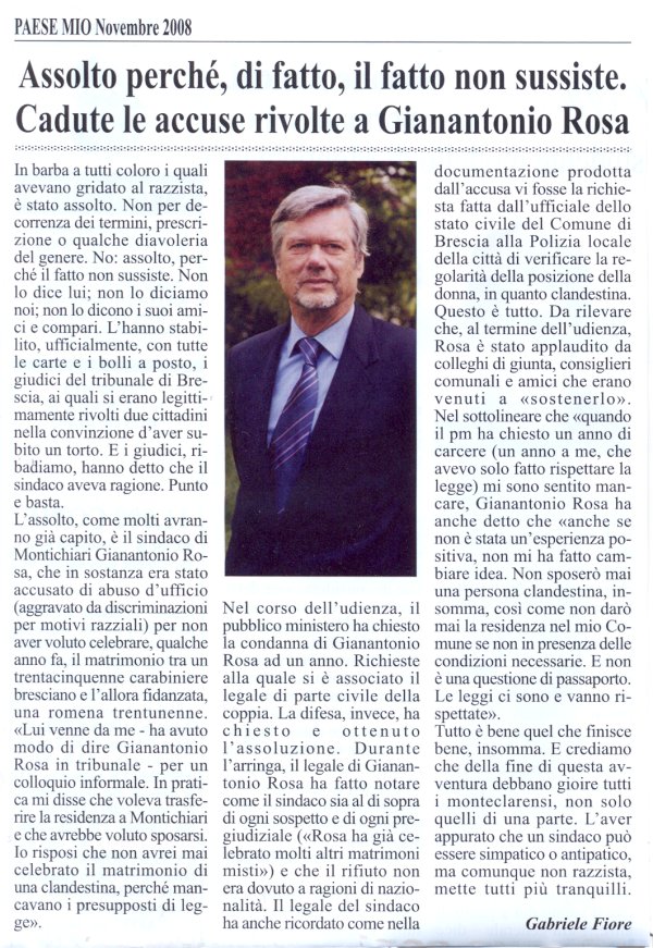 Il dubbio è (o era) lecito e lo scriviamo lo stesso giorno in cui un afro-americano (un “negro”) diventa Presidente USA. Questa riflessione ci è stato proposta dalla lettura dell’articolo a firma di Gabriele Fiore su “Paese Mio” (“Mio” di chi?) circa la sentenza che ha assolto Gianantonio Rosa dall’accusa di avere abusivamente mancato di celebrare il matrimonio tra un trentacinquenne italiano e una coetanea dell’Est. Com’è possibile che un Pubblico Ministero accusi qualcuno, oltre che di abuso d’ufficio anche dell’aggravante del razzismo e che poi la sentenza ci dica che “il fatto non sussiste”? Bando ai dubbi e con rispetto per tutte le sentenze, accettiamo di buon grado il parere di Fiore che, da buon sostenitore di Rosa, chiede ai suoi concittadini di gioire per la tranquillizzante assoluzione. Gioiamo, ma lasciateci esprimere anche altre considerazioni. |